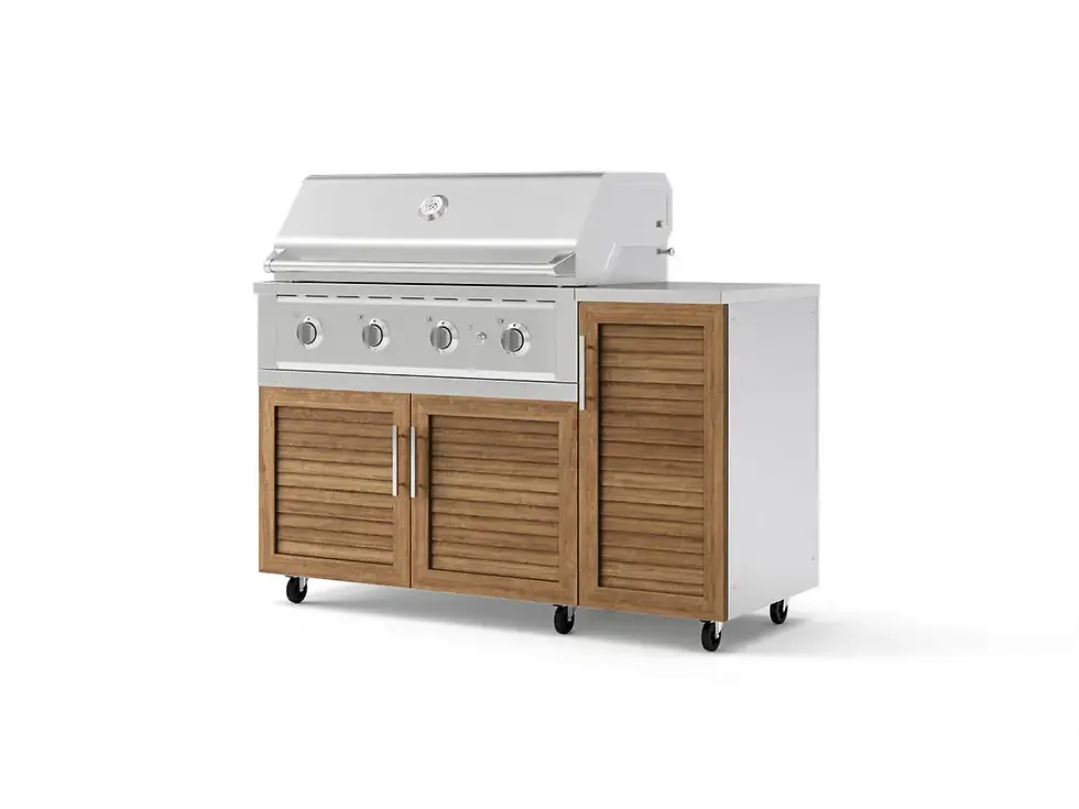 Grill anywhere, anytime. The NewAge Outdoor Grill Island with Casters enhances your outdoor cooking experience with effortless mobility and flexibility. Built to meet every need and designed to fit any space, the Outdoor Kitchen Grill Island provides both cooking and storage solutions. Constructed from aircraft-grade aluminum, the durable, weather-resistant cabinets offer ample storage to stay organized. Glossy tempered glass doors with integrated handles add a sleek, modern touch that complements any home. The cabinets resist mold, mildew, stains, and corrosion, ensuring long-lasting performance. A scratch-resistant coating protects against wear, while heavy-duty double-walled doors provide strength and stability. Designed for convenience, they are easy to clean and maintain, with height-adjustable levelers for stability on uneven surfaces. Magnetic door latches and soft-close hinges ensure smooth, effortless operation, while the reinforced frame enhances longevity. The 16 in. 3-Drawer Cabinet offers efficient storage for grilling tools, utensils, and small cookware and essentials organized and within easy reach. Two extra-deep full extension drawers with soft-close support up to 75 lbs. each, with a total weight capacity of 425 lbs. The Platinum Grill Series is engineered for power, precision, and versatility, featuring a sturdy, dual-layered hood with a full-length, no-slip grip handle for a secure, confident grip. Three high-performance H-shaped burners deliver up to 78,000 BTUs, ensuring even heat distribution across 503 sq. in. of cooking space on the 33-inch grill, 559 sq. in. on the 36-inch grill, and 631 sq. in. on the 40-inch grill. Achieve slow-cooked perfection with a wide, powerful rotisserie burner and a precision temperature gauge, while the integrated grease tray simplifies cleanup by channeling excess grease away from the burners. Elevate your cooking possibilities with Sear Zone Burners, perfect for boiling, simmering, frying, and preparing sauces. A flame-thrower direct-pilot ignition ensures quick, reliable startups, while LED accent control knobs and heat-protected interior lights make nighttime grilling effortless. Built for performance and convenience, this grill is your all-in-one outdoor cooking powerhouse. The set is finished with durable, premium countertop options, or in a no-top configuration that allows you to select your own countertop surface for added customization. Elevate your outdoor cooking with the NewAge Modular Outdoor Kitchen and make every meal an unforgettable experience.